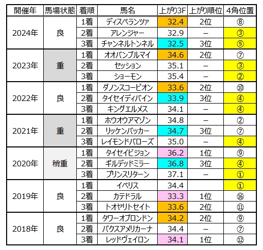 今年は良馬場開催のため、このレースで上がり3F3位以内馬が少なくとも2頭は絡むはず。そこで、いつものまとめをやってみた。※下表参照