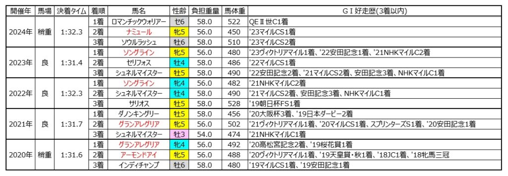 過去10年で1分31秒台以下の高速決着になった年と1分32秒以上かかった遅い時計で決着した年を表にまとめた。すると、高速決着組は3歳~5歳までで決着、且つ牝馬が走っていることがわかる。