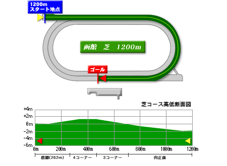 上記コースレイアウト図を見てもらえばわかる通り、スタートしてから高低差3mの上り坂を上った後は、3コーナーを回った辺りから1mの緩やかな下りになるコース。最後に短い平坦な直線が262mあり、下り部分からゴールまでは持続力が問われる。イメージとしては、京都競馬場を小回りにした形態だ。内をロスなく回りラスト1Fの失速を我慢出来る先行馬が有利なので、距離短縮馬に注意。