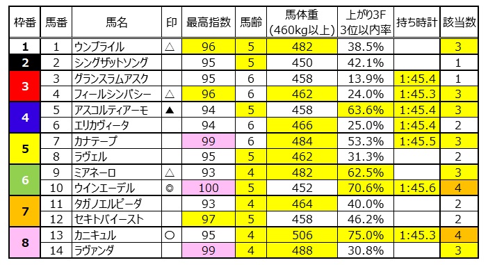 相手は⑬カニキュルと⑤アスコリティアーモの2頭を厚めに買いたい。後は速い時計が出せる項目に該当する①ウンブライル、④フィールシンパシー、⑨ミアネーロまで押さえる。