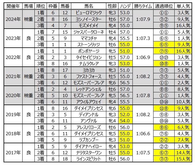 表から、人気薄(6番人気以下)で激走した馬たちは7頭中5頭が負担重量55.0kg以下の軽ハンデ馬だったことがわかる。また、いずれの馬も4コーナー8番手以内に位置して突っ込んで来ており、もっと言うと近2年の馬はレース映像を見るとわかるが内ラチ沿いをぴったりロスなく回り、直線抜け出す競馬をしている。このことから、内枠に入った軽ハンデの差し馬には十分に警戒したい。