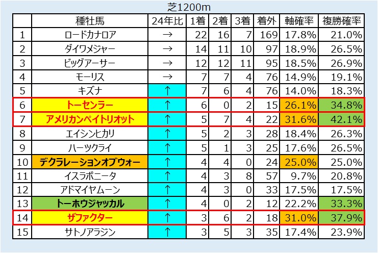 このうち内枠に入った軽ハンデ差し馬は①ヤマニンアンフィルと④ミルトクレイモーの2頭。この2頭なら種牡馬ランク2位ダイワメジャー産駒の①ヤマニンアンフィルを推したい。この馬を本命とする。