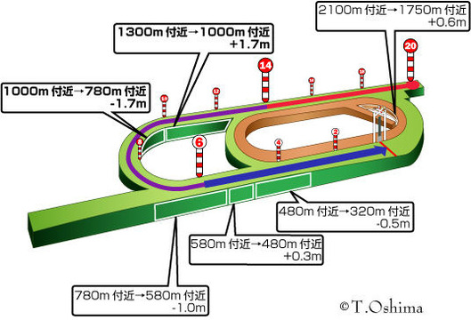 ・最初のコーナーまでの距離947.9mと非常に長く、急な3・4コーナーで息が入り、後半は下り坂からJRA最長の直線658.7mに入るコース。