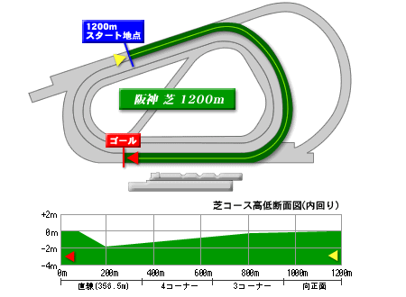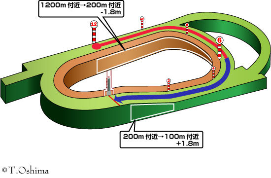・スタートしてから下りが続くが、内回りのため最初のコーナーまでの距離が258.2mと短く、前半のペースは小倉や中山のように33秒台前半という流れにはならない。