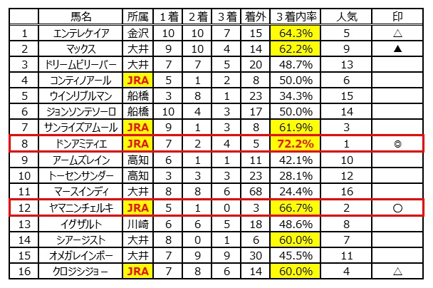 非常に難解なレース。ここは、複軸として下表通り3着内率が突出している⑧ドンアミティエを本命にし、複勝に絡みやすい3着以内率上位から買ってみたい。