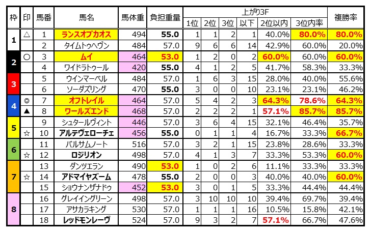 以上が上位3頭で、次点は①ランスオブカオス。この馬、上がり3F3以内率が80.0%とメンバー中2位、複勝率が80.0%と⑧ワールズエンドに次ぐ率なので、3着に喰い込む可能性が高い。ただ、どちらかというとピンパーの馬なので、上位3頭とは印に差をつけた。