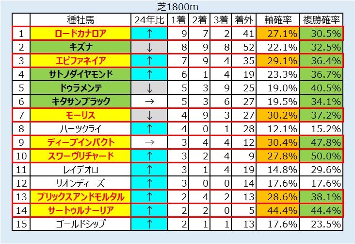 ・単勝15倍以内のサトノダイヤモンドも狙える。前走1~3着だった産駒は複勝率100%。