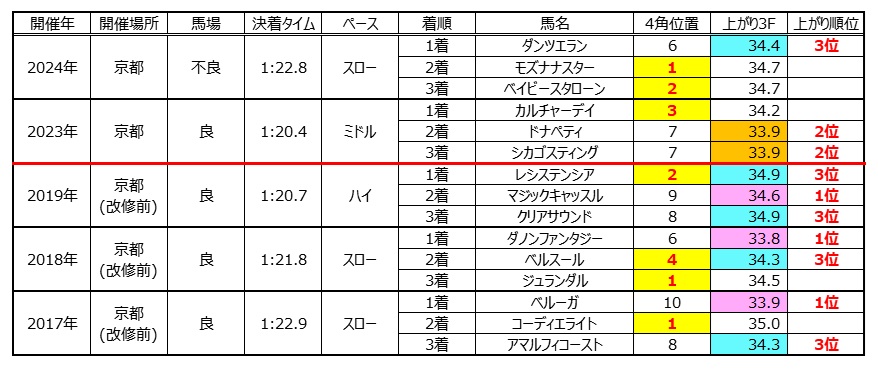 まずこのレースの特徴だが、上記まとめの内容と下表を比べて欲しい。2020年~2022年は京都競馬場改修のため阪神開催だったので割愛したが、「スローからの瞬発力勝負」になったのは改修前で、ペースに関係なく上がり1位の馬が馬券圏内に入っており、4角の位置も1桁ではあるものの、後ろからの追い込みが利いている印象。