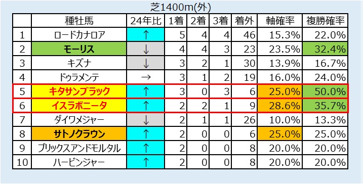 今年の出走馬12頭中この条件に当てはまる馬は2頭。⑤ブラックチャリスと⑥ベレーバスクだが、⑤ブラックチャリスが2戦とも1200mなのに対し⑥ベレーバスクは1400m、1600mでのもの。今レースが京都1400m外回りということを考えると、当然本命は⑥ベレーバスクだ。