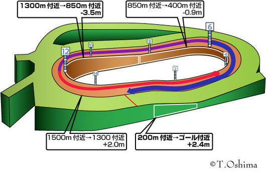 ・スタートから1・2コーナー中間地点まで上り坂のため前半ペースは上がらずスローが基本。結果、逃げ・先行馬有利。またペースが落ち着きやすいのでマクりも利く。※特に下級条件。