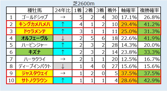 小倉芝2600mは、レースの上がり3Fで3位以内の脚を使う馬が3着以内に入るという特徴を活かした予想をすることが重要。そのため、過去芝2000m以上のレースでの上がり3Fの3位以内のデータをまとめてみた。また、上がり4Fのロングスパート勝負になった時、過去厳しいラップを刻んで上位に来ている馬は有力。そこで過去1年間で3着以内に入ったレースの上がり4Fのラップもまとめた。※下表参照