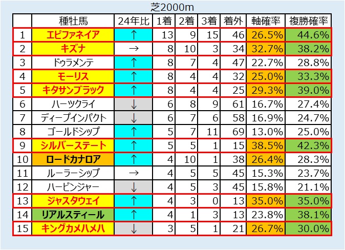 ・1~9番枠で単勝15倍以内のエピファネイアを狙う。【12,8,9,13】勝率28.6%、連対率47.6%、複勝率69.0%。