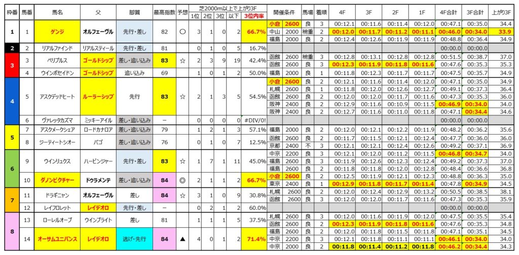 まず、決着タイムから。この条件の標準時計は上記の通り2分39秒台だが、前走足立山特別で2分36秒台と破格のタイムで2着に入ったのが⑩ダノンピクチャー。この馬ドゥラメンテ産駒(キンカメ系)のため、道悪は苦にせず、稍重程度なら問題なし。今回はきっちり勝ち切る。