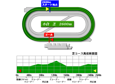 ・向正面からスタートし最初のコーナーまで263.9mで、その後1周半する長距離戦。