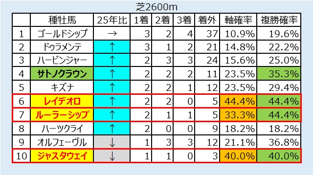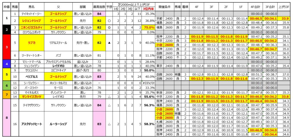 後は外枠ながら長距離で力の要る馬場が得意なレイデオロ産駒の⑭サンライズガッツ、ラップが優秀で持ち指数が1位タイの⑮テイクザクラウン、キンカメ系なら道悪も得意な⑯アスクデッドヒートまで。