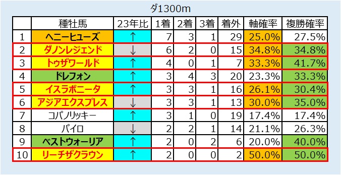 ・ダ1300mよりスタミナを求められるため、距離延長馬の先行押し切りが難しくなる。