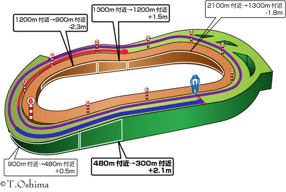 ・スタート地点はダート。最初の100mは緩い下りでその後342.0mの上り坂で最初のコーナーに入るため、外枠の馬はポジションを落としやすい一方、内枠は揉まれにくい。従って枠の有利・不利が出にくい。