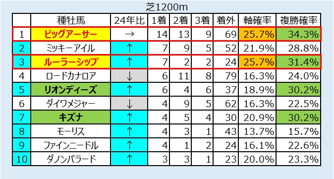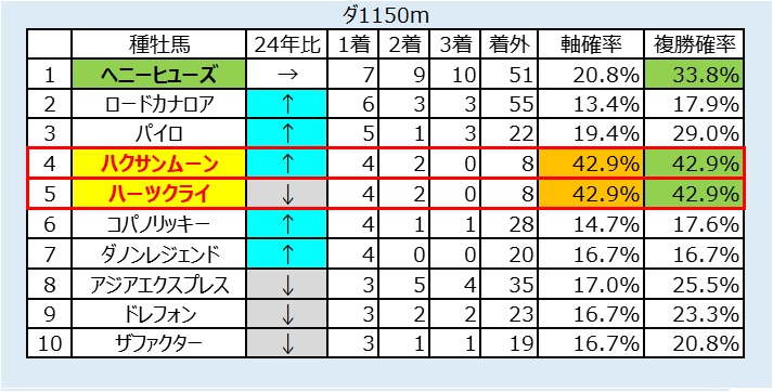 ・先行力やスピードが重要となるため、短距離に出やすいストームキャット系種牡馬を狙う。特に良馬場でのヘニーヒューズヨハネスブルグ湿った高速馬場におけるアジアエクスプレスに要注意。
