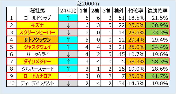 2~7枠のキズナ産駒を狙う。【6,3,4,15】で勝率21.4%、連対率32.1%、複勝率46.4%。