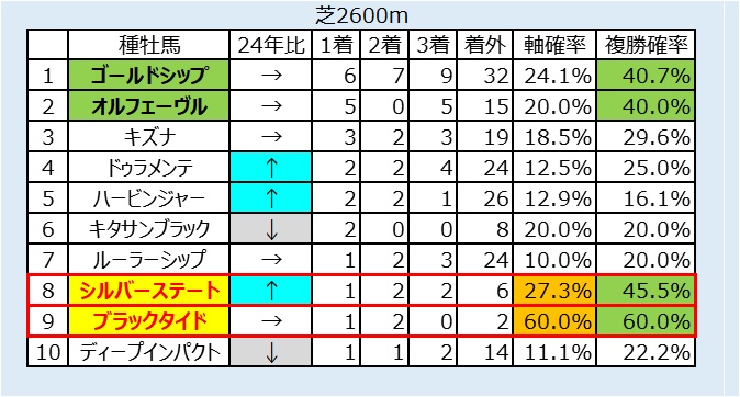・時計がかかるタフな長距離戦のため、前走2200m以上からのローテーション馬を狙う