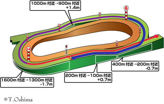 ・コース断面図を見ても平坦ではなく向こう正面からゴールまで上り坂が続くためタフなコース。良馬場時は距離延長馬は苦戦距離短縮馬が好走する。