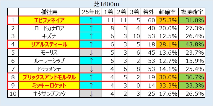 ・1勝クラス以下で1~9番人気のエピファネイアを狙う。【11,6,4,38】勝率18.6%、連対率28.8%、複勝率35.6%。